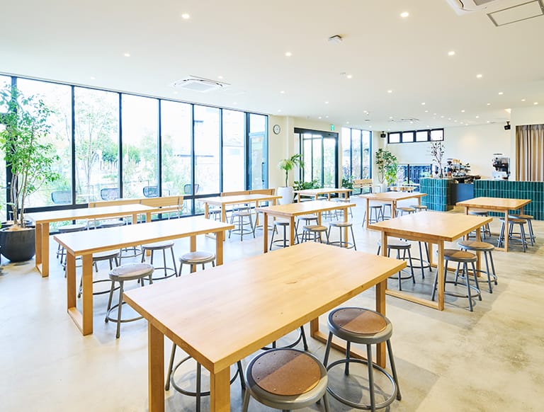 瀬戸の歴史を感じる大正時代の商家(しょうか)を引き継いで、おもだか屋は開業しました。土壁や梁など、かつての趣を大切にしながら、時代に合った心地よい空間に仕立てています。床には瀬戸で長く作られてきた本業焼(ほんぎょうやき)のタイルをあしらいました。一枚一枚、色や表情が異なり、やきものの文化を感じていただくことができます。店内はベビーカーや車いすでも入りやすいよう整えておりますので、安心してご来店ください。