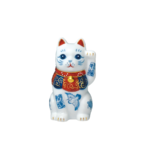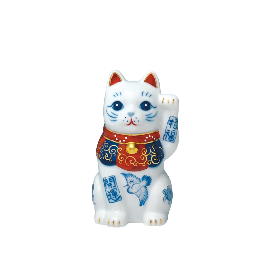 「染錦招き猫」は、真っ白な磁器肌に染付ならではの優雅さと、『招き猫の故郷』といわれる瀬戸の招き猫の特徴である前垂れを纏い、やきもの好きも満足させる仕上がりになっています。
